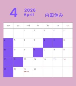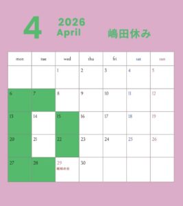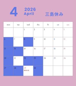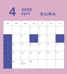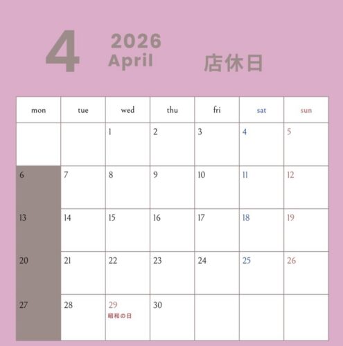 4月のお休み。。 2026.03.26 Post Share Hatena Pin it 4月より定休日、営業時間が変わります! お店の定休日→毎週月曜日のみ 各スタッフにより休みが異なります 営業時間→午後7時まで(メニューにより最終の受付時間が異なります。カットの場合午後6時となります)気になる点等あればお気軽にスタッフにお願いいたします これからもご予約を取りやすく、通いやすい環境を整えてまいります 今後ともよろしくお願いいたします ← → x × Post Share Hatena Pin it 4月からの定休日